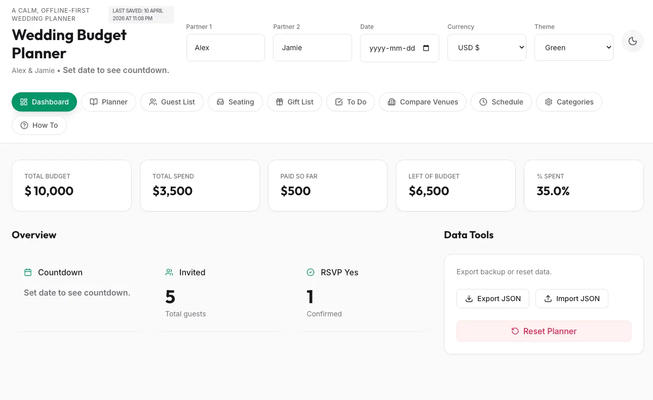A complete offline wedding planner — budget tracker, guest list, seating chart, vendor contacts, to-do list, and more. One file. No subscription. No data leaves your computer.